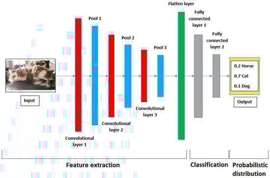 CNNs have found their application in different sectors such as bio-medical and image recognition because they were originally built to mimic biological neuron response [25], but their application for fault detection is quite recent. CNNs are a type of feed-forward artificial network, which has the advantage of automatic feature extraction thanks to convolution layers. Several structures have been developed for image recognition, such as LeNet-5, VGG16, and ResNet, but their application with IM signals has not proven to be successful. There are different types of layers besides the convolution ones, the pooling layer (PL), batch-normalisation layers (BN) and the fully connected layers (FCL) [18]. Figure 13 illustrates a CNN example for animal classification.