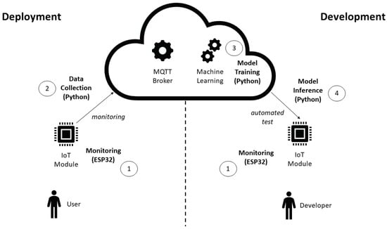 The proposed automated test approach is illustrated in Figure 2. There are three environments considered: the deployment, cloud, and development environment. The user interacts with IoT modules in an deployment environment, such as a smart home. The deployed modules send their status to a MQTT (Message Queuing Telemetry Transport) [26] broker in a continuous fashion. The MQTT broker available in a cloud computing environment, where other services such as storage could also be available. The IoT module status metrics are used to train an unsupervised machine learning model. This trained model is used in an automated test that the developer applies to an IoT module under development. As the model was trained with the deployment scenario data, we advocate that the resulting automated test resemblance to a real-world scenario is bigger than a manual test that the developer could create.