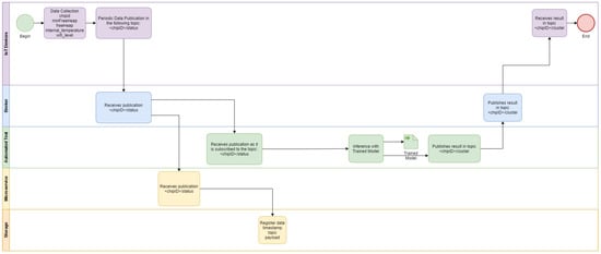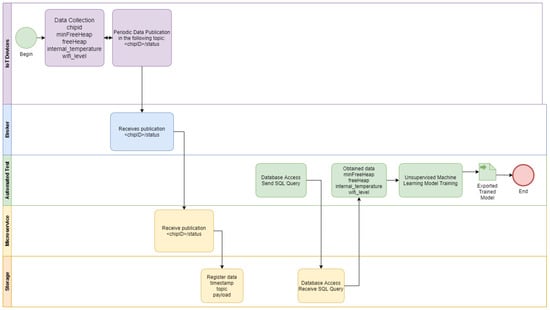 ESP32 modules with different firmware versions (and even for different applications) send their data frequently to an open MQTT broker using the integrated Wi-Fi communication (1). A script is responsible for data collection from the open MQTT broker deployed in a cloud computing environment (2). The data collected are used to train the K-Means model with another script deployed in Google Colab cloud environment, with the cluster labeling (i.e., good or bad) performed by the developer (3), as detailed in Figure 3. The trained model is imported by a script responsible for inference that receives the real time data from the ESP32 modules and classify them according to the labels provided by the developer in the previous step (4). The inference procedures is detailed in the BPMN diagram of Figure 4. The K-Means clustering algorithm [32] was chosen because of its maturity. An additional motivation is that this algorithm showed good results in other applications, such as image segmentation [33].
