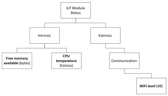 As illustrated in Figure 5, the IoT module status is composed by intrinsic and extrinsic metrics. Intrinsic metrics could be the total free memory available in a given moment, or the CPU temperature. An example of extrinsic metric is related to communication, that is subject to external environmental conditions. In this example, we consider the ESP32 which has a built-in Wi-Fi communication, it is possible to obtain the Wi-Fi level of the network which the IoT module is connected to.