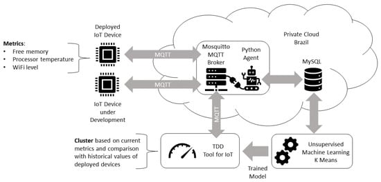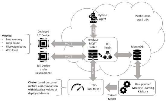 The TDD procedure is described in the Figure 14. The TDD tool with the trained machine learning model is subscribed in IoT status topics. Each status message from the IoT device under development (sent as a result of the periodic Python Agent request) is relayed to the TDD tool by the MQTT broker, and it is used to compare the current status to the clustered historical values from deployed devices.