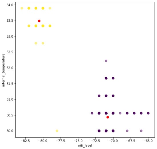 The K-Means clustering algorithm was performed using the aforementioned four metrics with the total number of cluster of two corresponding to a good and bad status clusters. After the clustering, the cluster label is performed by the IoT developer based on the visual representation, such as the one represented in Figure 18.