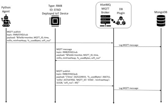 The data collection procedure is detailed in the Figure 13. Each second the Python agent queries the IoT devices deployed in the smart home, which send their status to the MQTT broker. All messages are registered in the NoSQL database by the plug-in integrated with the HiveMQ MQTT broker.