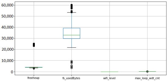 We collected a total of 595,554 readings from 22 ESP8266 devices with 13 different firmware versions from 10 July 2021 to 17 July 2021. The metrics of the ESP8266 devices are freeheap in bytes (i.e., free memory available), wifi_level in decibels (i.e., local Wi-Fi network level), fs_usedbytes (i.e., total bytes used in the filesystem) and max_loop_wdt_cnt (i.e., the maximum loop watchdog count).