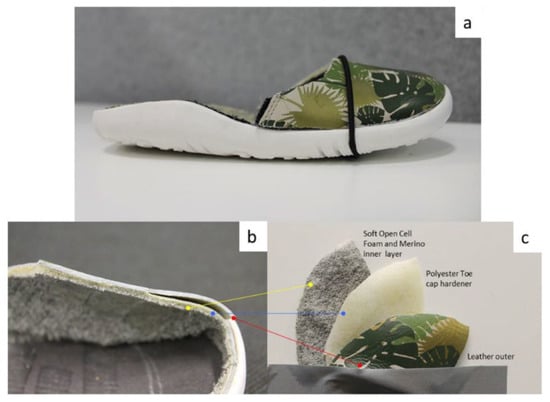 (a) Example of Bobux shoe with midsole removed; (b,c) Upper of the toe area showing the cross-section and layers of the shoe.