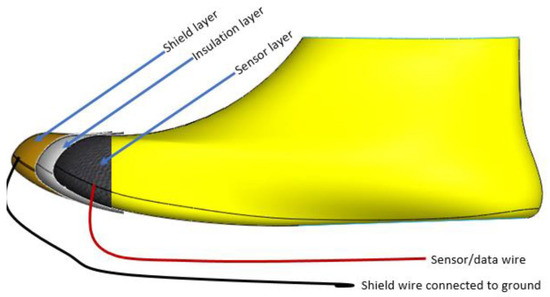 Normally, foot length is measured outside the shoes. In typical foot-measuring devices, the heel of the child needs to coincide with the curved part of the device, and a horizontal bar is moved until it touches the longest part of the toe. The number that this bar stops at indicates the size of the child’s foot. Ideally, the heel sits at the heel counter. This is designed so that it can hold the heel in position, giving the foot more stability during variable movements, together with the whole shoe upper, which firmly holds the foot inside the shoe. This creates a basis for where to place the sensors. The heel will not experience much change, because the heel will always stay in the heel counter. Therefore, the toe area is an ideal place to put the sensors, as this would see the most change in length. This area is also ideal as layers can be easily fitted and concealed. In shoe manufacturing, polyester material is sandwiched between the inner layer of the shoe and the protective outer layer of the shoe as depicted in Figure 2. This polyester material (called a toe puff) hardens the toe area, which keeps the shoe in shape and adds more protection from scuffing during child’s play.