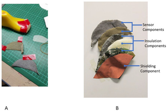 Figure 5B shows the different layers of sensor, insulation, and shielding components of Sensor Prototype 1. Sensor components shown include stainless steel and silver knitted sensors. These two materials were evaluated for their effectiveness, and the results presented in Section 3. Insulation components are the layers of the shoe, which includes (top to bottom) the sock liner, toe hardener/toe puff, and synthetic leather. The shielding component shown is copper taffeta. The sensor and shielding components are separated by the insulation components.