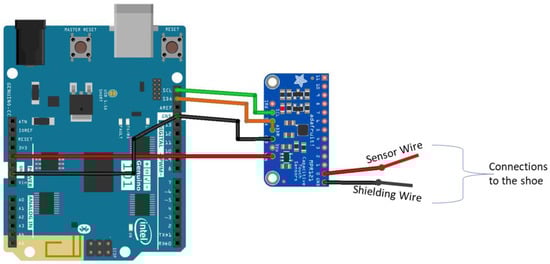 To create Sensor Prototype 1, conductive textile materials from Auckland University of Technology (AUT) Textile and Design Lab were obtained, and samples were knitted by the knitting technician for a specific size of toe cap. The toe-cap dimensions were obtained from the Bobux design database (Bobux is a New Zealand children’s shoe company that started creating soft sole shoes for infants in 1991). Two different fabric sensors were acquired, and these were installed inside two different shoes of the same size. The fabric sensors are connected with a coaxial cable to reduce outside interference/noise in the readings. The sensors were read initially by the Agilent E4980A LCR meter (Keysight Technologies, Santa Rosa, CA, USA, Agilent E4980A) and again by the Arduino 101 with an MPR121 capacitive sensing chip. Arduino 101 was connected to a PC and data were logged through Arduino’s built-in serial monitor. The system layout is depicted in Figure 1.