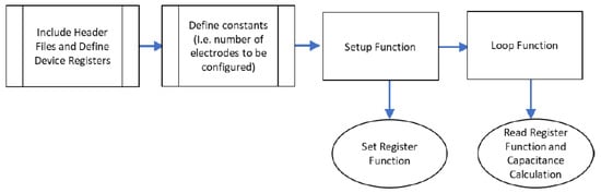 For MPR121 to communicate and read the correct capacitance values, an algorithm is followed as recommended by the MPR121 datasheet. Open-source code and libraries that are readily available online were used with alterations to fit the paper’s objective. Pseudocode is described in Figure 8, detailing the functions used in the program.