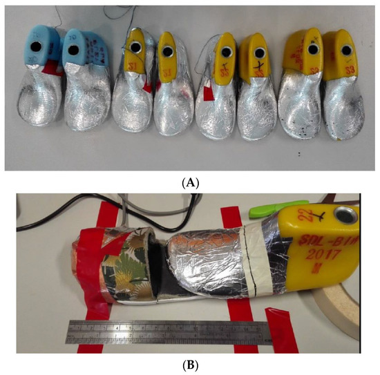 To test whether capacitance truly increases when the toe gets closer to the sensor, 3D-printed shoe lasts were covered in aluminium conductive tape. This is to replicate the conductive characteristics of the human foot and will be referred to as the foot phantom. Although aluminium may not have the same conductivity and electrical behaviour as the human foot, these were sufficient to undertake the tests carried out for Sensor Prototype 1. These lasts are of varied sizes; the range used was sizes 20–23 with equivalent lengths between 13.5 cm (Size 20)–15.5 cm (Size 23) as shown in Figure 9A. The test setup is shown in Figure 9B.