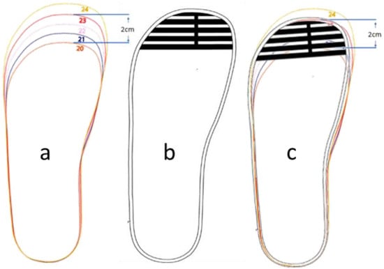 (a) Insole information from Bobux showing the 2 cm mark. (b) Sensor pattern segmented but connected in the middle. (c) Sensor pattern overlapped with insole information.