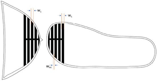 Striped pattern drawn on size-23 toe cap (right) and insole (left); wc = width of conductive knit, and wnc = width of non-conductive knit.