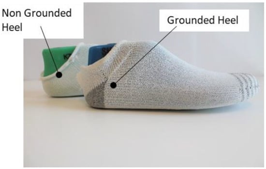 Version 3 was chosen for manufacturing the final assemblies of the sock sensors because it achieved a full textile connection and the seamless integration of the knitted sensor from upper to sole. There were two knitted sock-sensor samples created for the test, characterized as grounded heel (GH) and non-grounded heel (NGH), as shown in Figure 13. Both samples were knitted with a combination of non-conductive polyester thread and 80/20 PET/SS conductive thread. GH contained a conductive knit patch on the heel and NGH did not. GH and NGH samples had the same knit layout on the toe area.