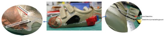 Apart from the sensor, there must also be an insulation layer, to support the sensor in place, and a shield layer to protect the sensor from false touches that can occur outside the shoe. This is an unwanted signal, which comes from an external influence, not the shoe wearer. The detection of the foot should only happen from the inside of the foot. The shield layer is another conductive fabric that helps decrease the interference from the outside of the shoe. The sensor, insulation, and shield make up the three layers of the toe-cap area of the shoe. The textile sensor transmits data to the electronics unit using the black and red wires shown in Figure 4. The black wire is connected between the shield and the ground (GND) pin of the electronics unit; the red wire is connected between the sensor and the signal pin of the electronics unit.