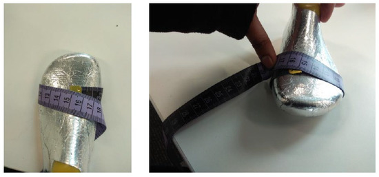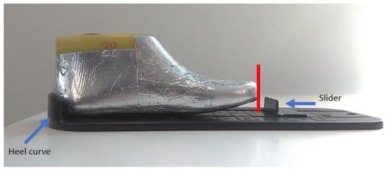 The test procedure called for the participants/children to be in a static (standing) position, with their heels at the back of the shoe, and with socks worn on both feet. During the test, the children’s guardians were asked to count from 1 to 10 after physical measurements—i.e., after foot length and foot circumference were measured. During the test, other parameters were recorded, such as Bobux shoe size (according to the Bobux shoe ruler), recorded by placing the child’s heel at the heel curve of the Bobux shoe ruler, and the slider on the opposite end being slid until it touched the longest point of the foot, as shown in Figure 20.