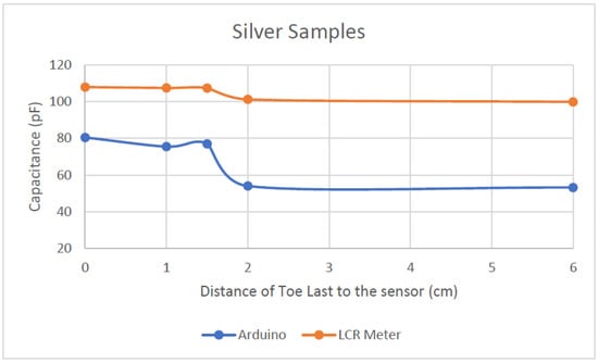 Silver sample capacitance readings comparison between Arduino and LCR meter.