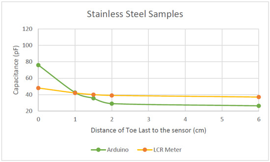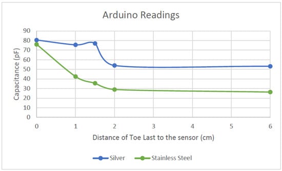 From Table 1, comparing the Arduino results, the two samples garnered two different capacitance ranges. The SS samples’ readings ranged from 26.3 to 76 pF, which corresponds to a capacitance range of 50 pF over 6 cm, whereas the silver samples’ varied between 53.19 to 80.5 pF—hence, a capacitance range of 27 pF over 6 cm. From these results, the sensitivity of the SS sample is greater (8.3 pF/cm) than that of the silver samples (4.5 pF/cm). This indicates that the SS sample has better sensitivity, which is more advantageous than the silver sample. A higher sensitivity means that the sensor can have more resolution in readings. This is suitable when measuring foot length because, especially from ages between 11 months old to 36 months old, the foot-length development is rapid. Therefore, a more sensitive sensor can pick up minor changes.