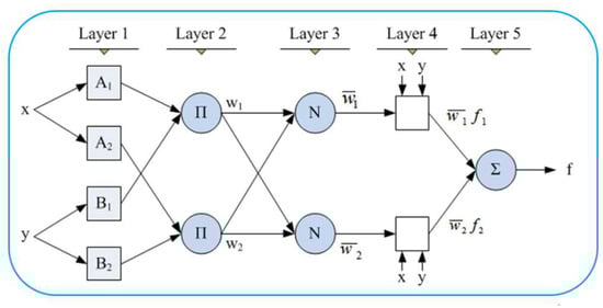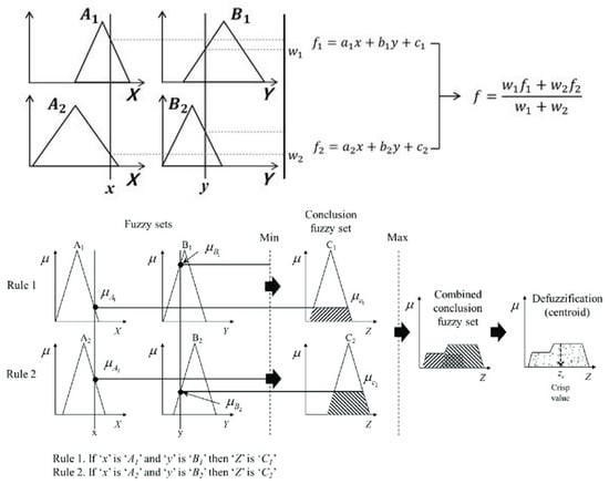 In the Sugeno type ANFIS, we used the weighted average defuzzification method and Equation (4) describes it []: