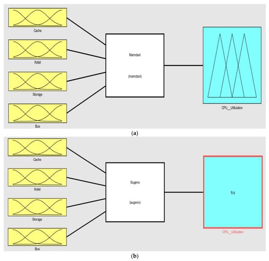 An adaptive neuro-fuzzy inference system that uses a rule base system was created by human experience and knowledge []. In this paper, to apply our idea we developed Sugeno type ANFIS and Mamdani type ANFIS models for assessing the utilization value of CPU, by evaluating the effect of RAM, cache, storage, and bus utilizations on CPU usage. There are some differences between the Sugeno and Mamdani ANFIS, i.e., they have a different knowledge base and outputs are varied. Sugeno type ANFIS generates the knowledge base by a training dataset and displays the numerical information about the CPU workload, and Mamdani type ANFIS has the rule base knowledge and outputs a linguistical assessment of the CPU utilization status, for example, low, middle, or high. Both ANFIS models contain the same modules, i.e., fuzzification, knowledge bases, inference engine module, and defuzzification modules []. Although Sugeno ANFIS and Mamdani ANFIS have the same modules, their constitution is different, i.e., the internal mechanism of the fuzzy inference system is different according to the rule base and training dataset. Figure 2 demonstrates the differences of the two models.