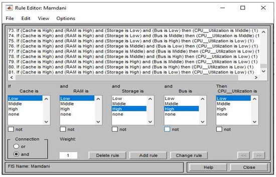 The determination inference method and rules i.e., creation of normalized layers, are different. The normalized layer of Mamdani ANFIS is based on an “if–then” rule base. The rule base of Mamdani ANFIS is linguistic and developed according to utilization data of hardware components. The rule base is developed by analyzing the impact of four input resource utilizations to one output CPU utilization with their three linguistic variables and consists of eighty-one rules. The rule development process is described in Figure 5. This rule base determines the inside layer of the ANFIS model. If multiple rules are active for a single membership output function, only one membership value must be selected. This procedure is called fuzzy conclusion or fuzzy solution. Mamdani type ANFIS finds the association among the variables for assessing the ANFIS []. The formula in Equation (3) is used for the centroid defuzzification method in Mamdani type ANFIS.