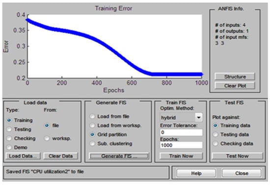 In order to control linguistic aspects for the evaluation and prediction of CPU consumption, neuro-fuzzy was chosen. It is a good alternative for decision-making and for quality modeling of the human knowledge base. Artificial neural networks have the capacity to learn. Like humans, an ANN can notice patterns that can be used as input to provide predictions. Performance, error reduction, and adaptability can all be increased by integrating an ANN and fuzzy logic []. An adaptable neural network is used to build the fuzzy inference system, also known as the adaptive neuro-fuzzy inference system. ANFIS may use human knowledge, such as fuzzy if–then rules, and approximative membership functions, to produce an input–output mapping from the input–output data pairs supplied for the purpose of neural network training. An adaptive neuro-fuzzy inference system (ANFIS) is the process of creating a FIS using the framework of adaptive neural networks []. By using two different techniques, ANFIS learning updates the parameters of the membership function: backpropagation for all parameters and a hybrid technique that uses least-squares estimation for the parameters relating to the output membership functions and backpropagation for the parameters relating to the input membership functions. As a result, at least locally, the training error lowers as learning progresses. The ensuing parameters, which define the coefficients of each output equation, are found using the least-squares approach and a fuzzy rule base of the Sugeno type. The training process continues until the required root mean square error (RMSE) between the desired and generated output is attained, the right number of training steps (epochs), or both. The foundation and subsequent parameters of a first order Sugeno type fuzzy system for estimating and forecasting CPU utilization are established in this study using a hybrid learning technique.