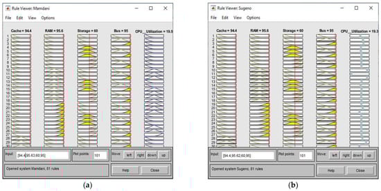 Thus, we completed the rule base, inference method determination, and defuzzification steps of our ANFIS models. In Figure 7, the Rule Viewer shows the input parameters of Mamdani type ANFIS and Sugeno type ANFIS where RAM = 95.6, cache = 94.4, bus = 95.0, and storage = 60.0. The Sugeno ANFIS evaluated CPU utility as 19.3. Mamdani ANFIS assessed it as 19.5 by following the established rule base. The linguistic result of “Low” is equivalent according to the membership function distribution. In the ANFIS Rule Viewer, we can perform the evaluation as shown in Figure 8.