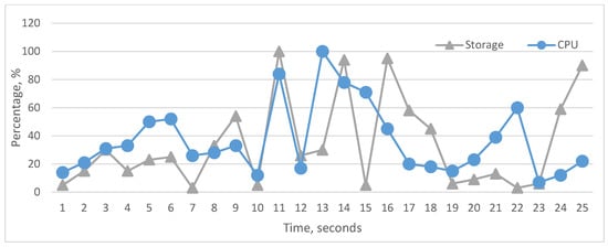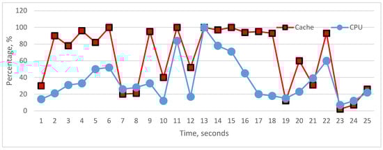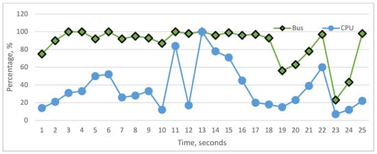 The graphical visualization of performance monitor data shows the actual state of the cache, RAM, storage, bus, and CPU utilization, Figure 8. According to these graphics, we can analyze the impact of the above-mentioned components on CPU utilization. To carry out analyses about the influence, we represented whole components’ influence on CPU and the particular influence of each component on CPU utilization. As we see in the graphs, it is difficult to realize fully linear characteristics between the CPU and particular components, but each hardware component in many cases has a linear impact on CPU. In Figure 9 and Figure 10, cache and RAM are more important, and the results show that their utilizations have more impact on CPU utilization on each level, i.e., increasing and decreasing the utilization level significantly impacts CPU. In Figure 11 and Figure 12, we can see that storage and even bus have linear characteristics when utilization is quite low. Moreover, the whole influence of all components is clearly represented in Figure 8 and the total utilization level of all components has more sharp and linear characteristics in CPU utilization. The results of the analyses demonstrate that the tested computer hardware has linearity and that each hardware component is compatible with the others. System compatibility indicates that no computer reconfiguration or redesign is required; instead, the computer system handles and manages the actual workload.