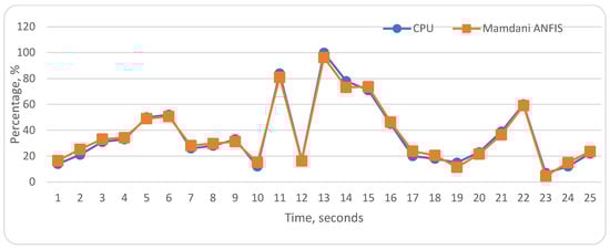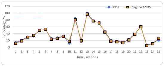 To evaluate the proposed ANFIS models, we compared the ANFIS data with actual data about CPU utilization. The achieved results are impressive despite some incompatibilities. The results of the ANFIS models are shown in Figure 13 and Figure 14. As aforementioned, we used linguistic variables and we defined their distribution diapasons. Table 5 shows error prediction results, and average accuracy in the “Middle” diapasons is 0.16 for our proposed Mamdani and Sugeno ANFIS models. In “Low” and “High” distribution diapasons, both models show a difference from the actual status of CPU, especially in the “High” level. The Mamdani type ANFIS model’s maximum and minimum error range is between 4.3 and −4.8. The maximum and minimum error indicator of Sugeno type ANFIS is between 5.6 and −3.1. Sugeno ANFIS has more accurate results in the “Low”, “Middle” levels. In the “Low”, “Middle”, and “High” linguistic levels, Sugeno ANFIS average error results are, respectively, −0.05, −0.18, and −2.26. Despite these weaknesses, we assess that the proposed ANFIS models achieved significant evaluation results.