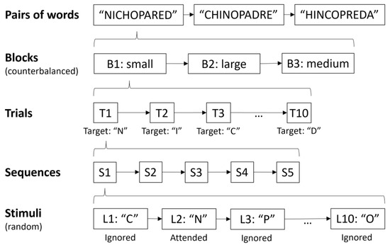 The duration of a single trial was 14,240 ms: 50 stimulus presentations (five sequences × 10 letters) of 128 ms and 49 inter-stimulus intervals (ISI) of 160 ms. A block was also defined as the set of trials from when the application was started by the experimenter until it was automatically stopped. In the present experiment, each block consisted of 10 selections (trials), in which 10 letters were focused on in order to complete two Spanish words of five letters each, without a space between them. For each condition, 3 blocks were carried out (30 selections per condition, 3 blocks × 10 trials). The first block was “NICHOPARED” (nicho and pared, niche and wall in Spanish); the second block was “CHINOPADRE” (chino and padre, Chinese and father in Spanish); and the third block was “HINCOPREDA” (hinco and preda, sink and booty in Spanish) (Figure 1). These words were chosen in such a way that in each block, all the available letters were used for a trial only once, and the words were never repeated between the different blocks under the same conditions. The participants were not presented with three blocks of the same size consecutively; instead, they tested three blocks with different sizes for the first pair of words (“NICHOPARED”) and then tested the three sizes again for the second pair of words (“CHINOPADRE”). Finally, they completed the third block with each size using the last pair of words (“HINCOPREDA”). For each pair of words, the order of the conditions for a specific participant was different (e.g., for participant P01, for “NICHOPARED”, the order was small, medium, and then large; for “CHINOPADRE”, the order was large, small, and then medium; and for “HINCOPREDA”, the order was medium, large and then small). The order was also counterbalanced—i.e., evenly distributed—across participants to prevent any unwanted effects such as learning or fatigue, and all conditions were equally distributed.