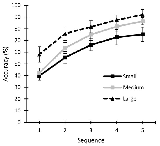 Accuracy (mean ± standard error) of the different conditions (small, medium, and large sizes) as a function of the number of sequences used.