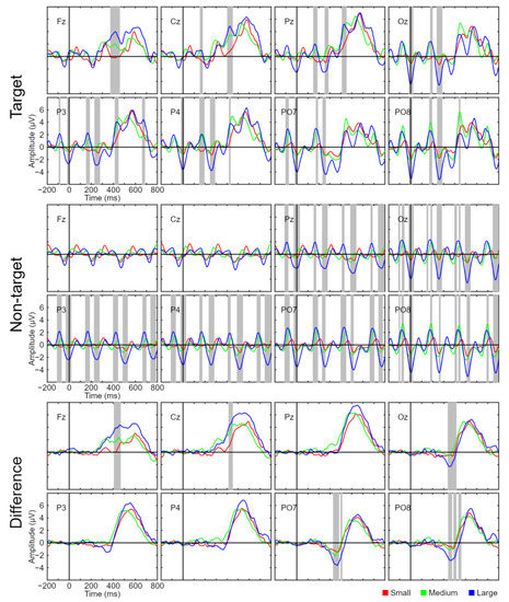 Grand average event-related potential waveforms for the target and non-target stimuli signals and the amplitude differences between them for all channels used (Fz, Cz, Pz, Oz, P3, P4, PO7, and PO8) and for the three conditions (small, medium, and large). Significant intervals are denoted with a gray background on the time axis. The Holm correction method was applied.