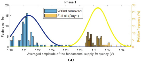 Following estimation of Feature 2 from the current signals corresponding respectively to the standard oil level (Day 1) and the 120 mL, 260 mL, 280 mL, and 490 mL of oil removal cases, estimates of the probability density functions of feature values are evaluated and compared, using histograms. Figure 10 shows histograms of Feature 2, extracted from the current signals of phase 1, for the different oil removal cases, with respect to the standard oil level case (Day 1).