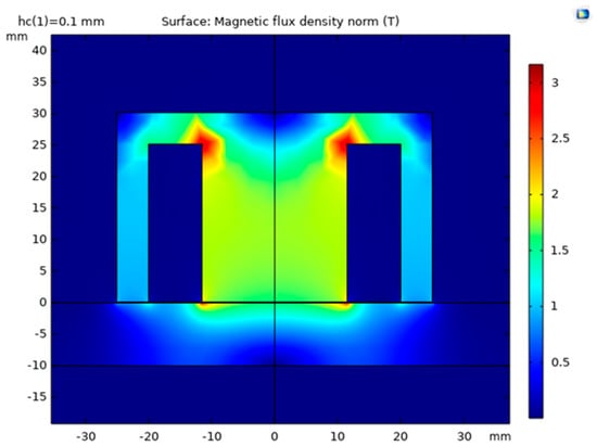 The simulation results are shown in Figure 2 and Figure 3 in the form of magnetic flux density distribution within the device. The magnetic flux is the strongest on the perimeter of the examined part, and it is found that it permeates approximately 5 mm distance from the steel plate surface.