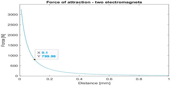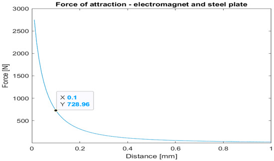 Simulation results of attraction between the steel plate and one electromagnet are shown in Figure 4. The electromagnets’ position was assumed to be 0.1 mm from the steel plate. This value allows us to accommodate imperfections in the manufacturing process of both elements.