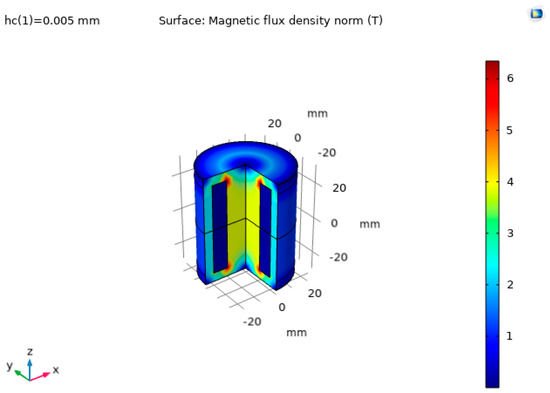 The mesh density, depicted in Figure 5, was increased closer to the contact surface between electromagnets.