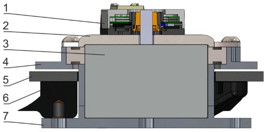 Cross-section of an integrated joint. 1—encoder, 2—steel plate, 3—electromagnet, 4—ball bearing housing, 5—brake disc, 6—brake pad, 7—electromagnet housing.