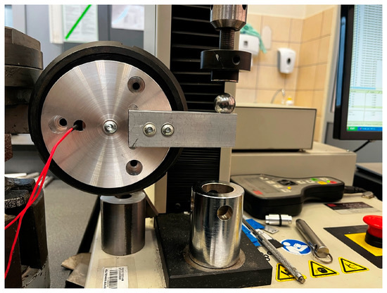In order to verify the assumptions made, a test system was built that allows examining the performance of different types of brake pads. The MTS Insight testing machine and the experimental rig are shown in Figure 11. The machine provided the force to rotate the device while measuring the displacement of the beam. The rotation of the device was monitored with an embedded encoder. This data correlated with displacement and provided information for braking torque plots. In addition, we were able to test the performance of an encoder while braking takes place.