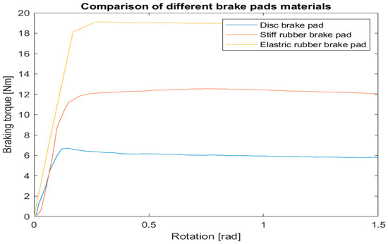 The braking torque measured using the experimental setup is plotted in Figure 12 for three different materials as a function of the rotation angle. The best results were obtained using elastic rubber brake pads.