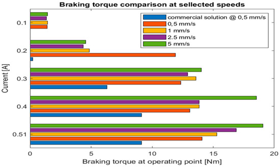 Further tests were performed for four braking speeds: 0.5 mm/s, 1 mm/s, 2.5 mm/s, and 5 mm/s. All tests were performed using the nominal voltage of an electromagnet—12 V with different current values in increments of 0.1 A. The results of the tests are depicted in Figure 13. The results clearly show that our solution provided a smooth braking curve along the whole test range in contrast to a commercial one that has tended to have bursts of torque alternating with skidding phases.