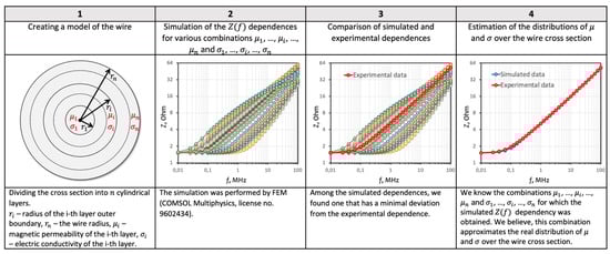Here, it may be useful to solve Maxwell’s equations with the help of computer modeling using the finite element method. This approach has proven itself well in solving problems related to MI [30,31]. It will be possible to find an approximation of the real distribution of magnetic permeability by modeling the frequency dependences of the impedance in cylindrical conductors at different radial distributions of magnetic permeability and specific conductivity and comparing the modeled dependences with the experimental ones. In future investigations, it will be possible to take into account that the cross-section of the wires, in reality, is not strictly circular, and also to study planar MI elements, such as amorphous ribbons and multilayer films, which, in particular, can be used in the tasks of a bio-detection [32,33].