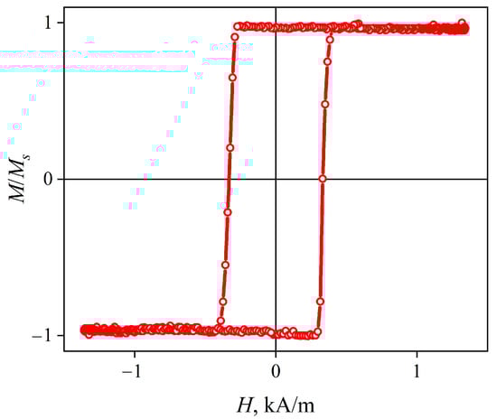 The longitudinal magnetic hysteresis loop of the CuBe/FeCoNi composite wire has convexity and squareness coefficients close to 1 (Figure 3). Such a loop indicates that axial magnetic anisotropy with a very small dispersion was formed during the annealing. The coercive field is approximately 0.32 kA/m.
