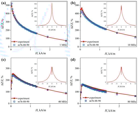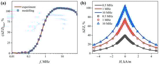 The ΔZ/Z(H) dependences were calculated (Figure 8, square markers) using the µi(H) dependences (Figure 11). We found that they are very close to the experimental ones. The same can be said about the frequency dependence of the maximum value of the MI (Figure 9).