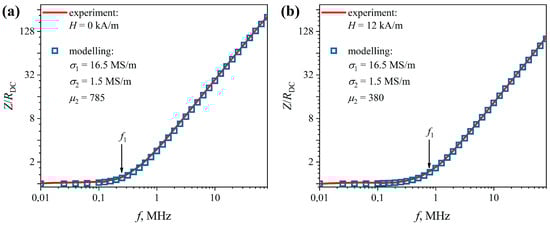 Reduced impedance versus AC frequency Z(f)/RDC. Experimental results were obtained in the magnetic fields H with intensity (a) 0; (b) 12 kA/m. The values of the magnetic permeabilities μi used in the modeling are shown in the figure.