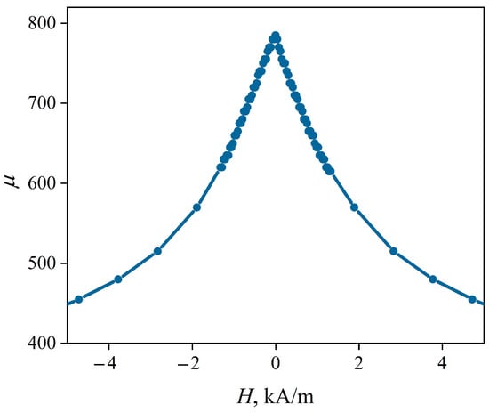 The field dependence of the magnetic permeability µ2(H) reconstructed using magnetoimpedance tomography is shown in Figure 6. It can be seen that µ2(H) reaches a maximum value of 785 in the zero external magnetic field, indicating a predominantly longitudinal orientation of the magnetic anisotropy axis. The same conclusion was obtained above from the analysis of the hysteresis loop (Figure 3).