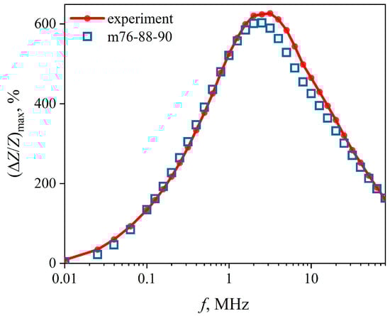 Dependences of the maximum value of the magnetoimpedance effect on the AC frequency (ΔZ/Z)max(f), calculated on the basis of data obtained both experimentally and using the m76-87-90 model.