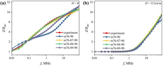 Note that the radial distribution of the magnetic permeability near the wire surface can be significantly affected by roughness on its surface [43,44]. Based on this, we introduced a third layer into the model, and r2 (the radius of the inner boundary of the third layer) varied from 87 to 89 µm (see Table 1). The introduction of the third layer noticeably brings the simulated and experimental dependences closer together (Figure 10). The m76-87-90 model gives the best result. However, at AC frequencies below 0.1 MHz and H ≤ Hp, the deviation of the simulated dependence from the experimental one reaches 10%. In all other cases, it does not exceed 5%. Interestingly, for H > Hp, all three-layer models give similar results. Perhaps this is due to the fact that as the wire approaches saturation, the radial distribution of the magnetic permeability becomes more uniform than in the fields H ≤ Hp.