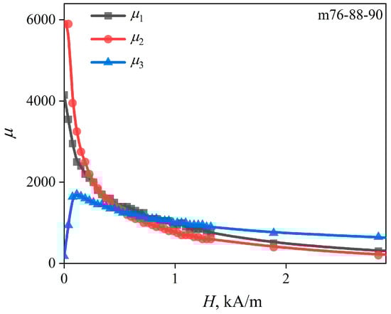 The dependences of the magnetic permeability of the wire regions (r1, r2, and r3) on the external magnetic field strength µi(H) were reconstructed (Figure 11) after comparing Z(f)/RDC dependences, calculated using the m76-87-90 model with the experimental ones measured in magnetic fields with strengths from 0 to Hmax, as described in Section 2.2.