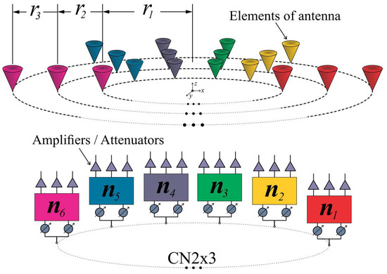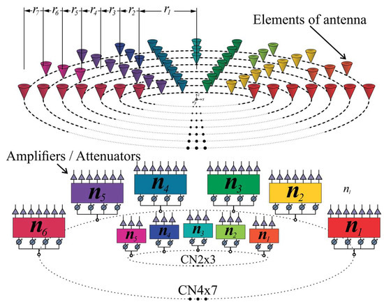 - Arce, A.; Panduro, M.A.; Covarrubias, D.H. An approach for simplifying a multiple beam-forming network for concentric ring arrays using CORPS. J. Electromagn. Waves Appl. 2014, 28, 430–441. [Google Scholar] [CrossRef]