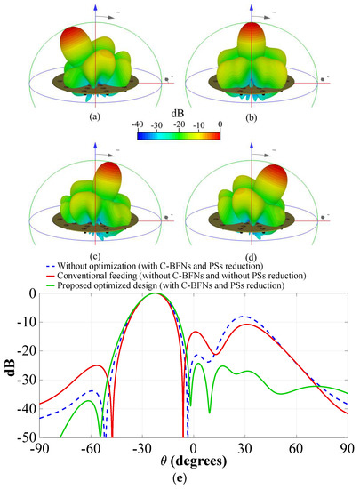 | Optimization | Number of Elements | Number of Phase Shifters | Reduction of Phase Shifters (%) | Scanning Range | Feeding Technique | Peak SLL (dB) | |