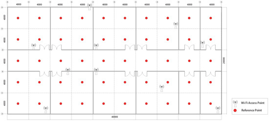 Figure 6 represents a schematic design of the simulation area’s architecture. Since the spacing of reference points was 4 m, our final number of reference points was 50. The locations of the reference points within each labeled area were determined, and a data point was taken at 0.18 m intervals, resulting in 529 data points in a label. The RSS and angle information were collected by Wireless InSite software. Related parameters needed to be set. The transmitting antenna of each AP had a sinusoidal waveform and a carrier frequency of 2.4 GHz [42]. The transmitting power of the signal was set to 150 dBm. There were a total of 26,450 data used for CNN training and testing. There were 5290 data for online validation.